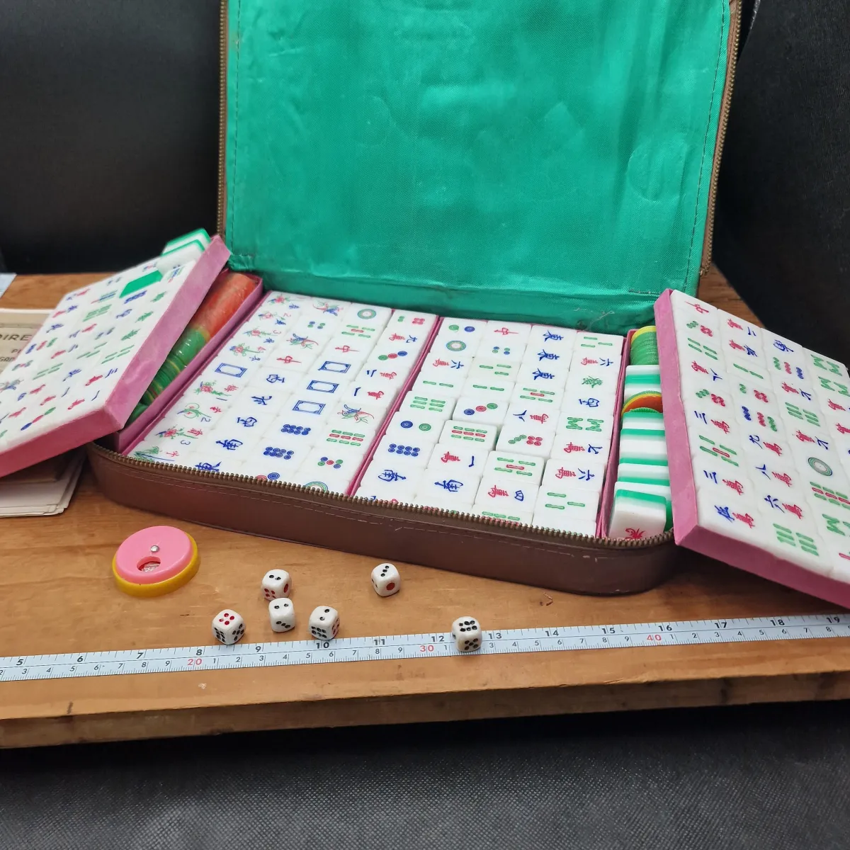 This is a vintage 1950's Mah Jongg set in a zip case. This doesn't look to have had much play time, with little wear to the tiles and some playing counters are still sealed. The zip up case is still fully fuctional with no rips. This is quite a rare item and a desirable set for players of a genuine vintage. there are two tiers of tiles and two sets of instructions, one booklet looks to be very old.